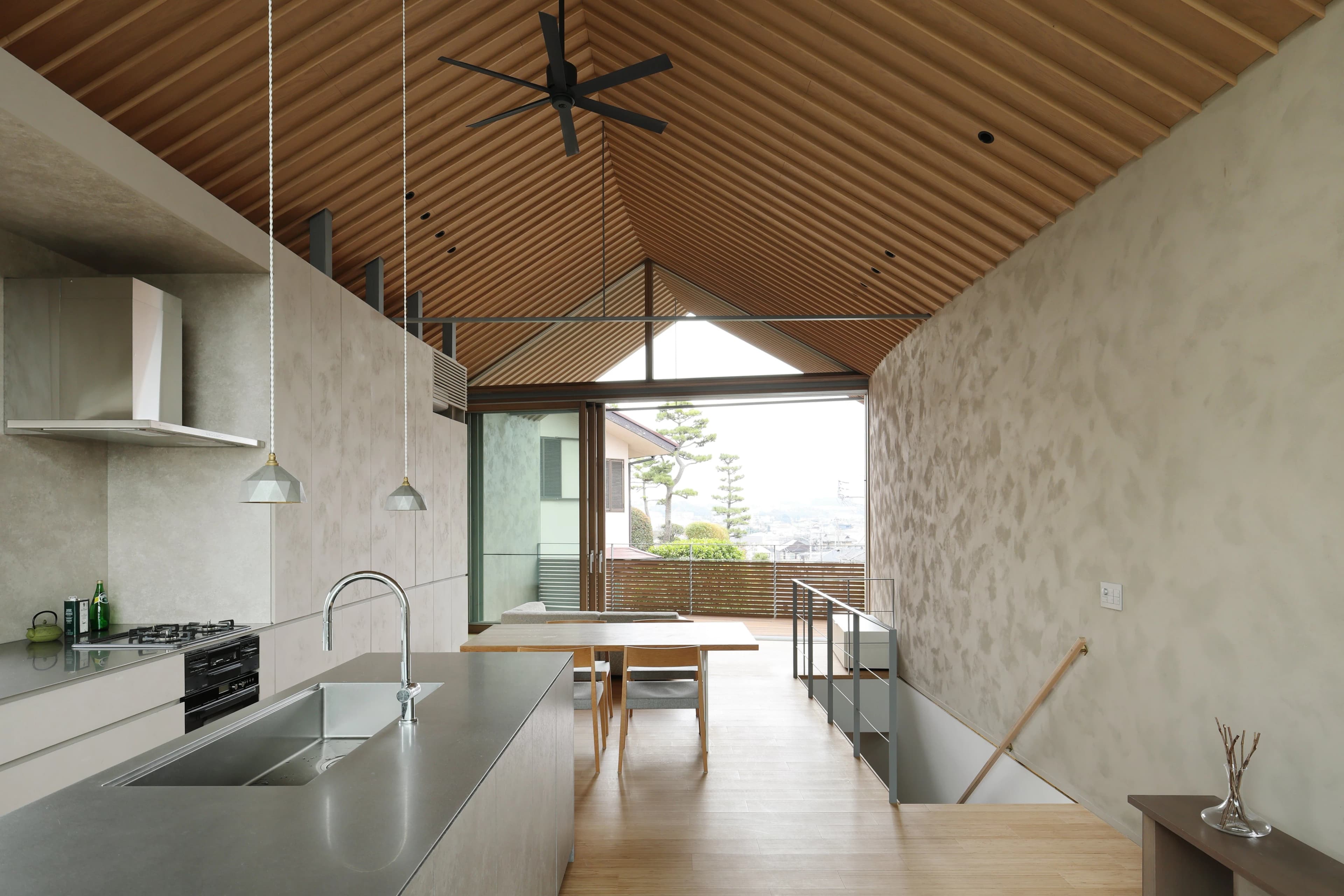 「風の家」は、藤沢の海から2キロぐらいの内陸側の小高い丘に建つ戸建住宅です。細い道が入り組んでいるため自動車がスピードを出すようなこともなく、路地で子供が遊んでいて、そこに海風が注ぎ込んでくるような、そういう町並みです。 施主様はマンションから戸建てに移られるとのこと、さらには海がすごく好きで、お子さんも海でよく遊ばれていると伺っていました。敷地は小高い丘の一番高いところにあり、風通しも日当たりも良好。路地に注ぐ海風がそのまま抜けていく感じをイメージし、「風」を一つのテーマに決めました。 施主様とお話を進める中で、特に関心を持たれていたのが温熱環境でした。一般的なエアコンのように空気を媒体とする空調だと、喉が痛くなったり乾燥しやすくなったりするため、できれば別の方法を取り入れたいというご希望があったんです。 そこで、まず中間期は通風を活用し、寒い時期や暑い時期には違う形で快適な環境をつくれないかと議論を重ねました。その中で、風が通り抜けるリビングダイニングに温冷水を循環させる輻射(ふくしゃ)空調を取り入れるというアイデアが生まれました。建物自体から放射されるエネルギーを利用して、夏は涼しく、冬は暖かく過ごせる家にしよう、という方向性が固まっていったんです。