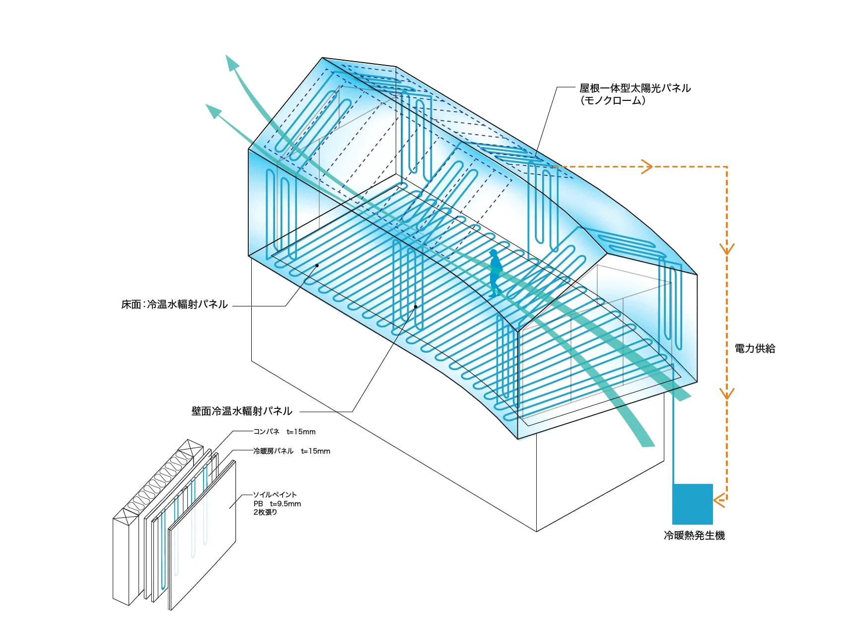 同時に、エネルギーのことも考え始めました。循環させる温冷水をつくるためのエネルギーをどう賄うか、という話になったんです。この地域は景観規制があったり、高さや屋根の勾配に制限があるような地域で、一般的なソーラーパネルをただ設置するのはそぐわないと感じていました。禁止されているわけではないのですが、建物のデザインと一体化したいという思いがあったんですね。 そんな中、別件でモノクロームさんのショールームを訪れる機会があり、そこでRoof-1を見たときに「これなら取り入れたい」と感じ、採用することになったんです。