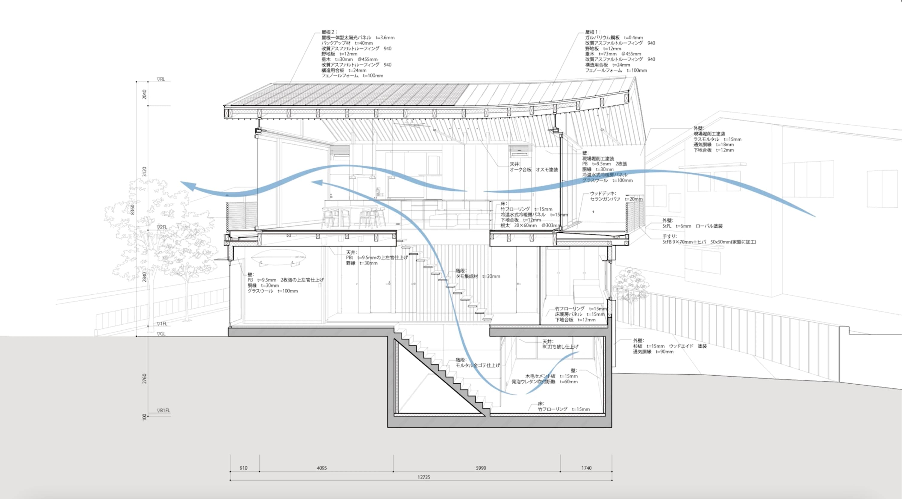 2階部分は、敷地に沿って曲がった形の設計になっています。断面で見ると、建物が海の方に向かっていくようなイメージですね。まるで風を迎えに行くようなトンネル状の空間にすることで、より自然な風の流れを取り込めるのでは、と考えました。 より詳しく解析してみると、建物が曲がっていることで風の流れが良くなり、体感温度も下がることが分かりました。2階を風が通り抜ける際には、地下からの冷たい空気を吸い上げるような効果も生まれます。 屋根についても、建物に合わせた曲線的な仕上げを、いかに一体的に見せるかが重要なポイントになりました。モノクロームさんと何度も協議を重ねる中で、最終的に屋根の一部に屋根一体型の発電設備を組み込むことにしました。その結果、パネルが目立つことなく、自然な景観を実現することができたんです。
