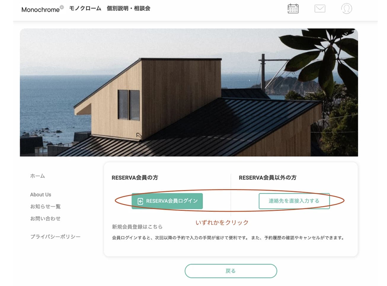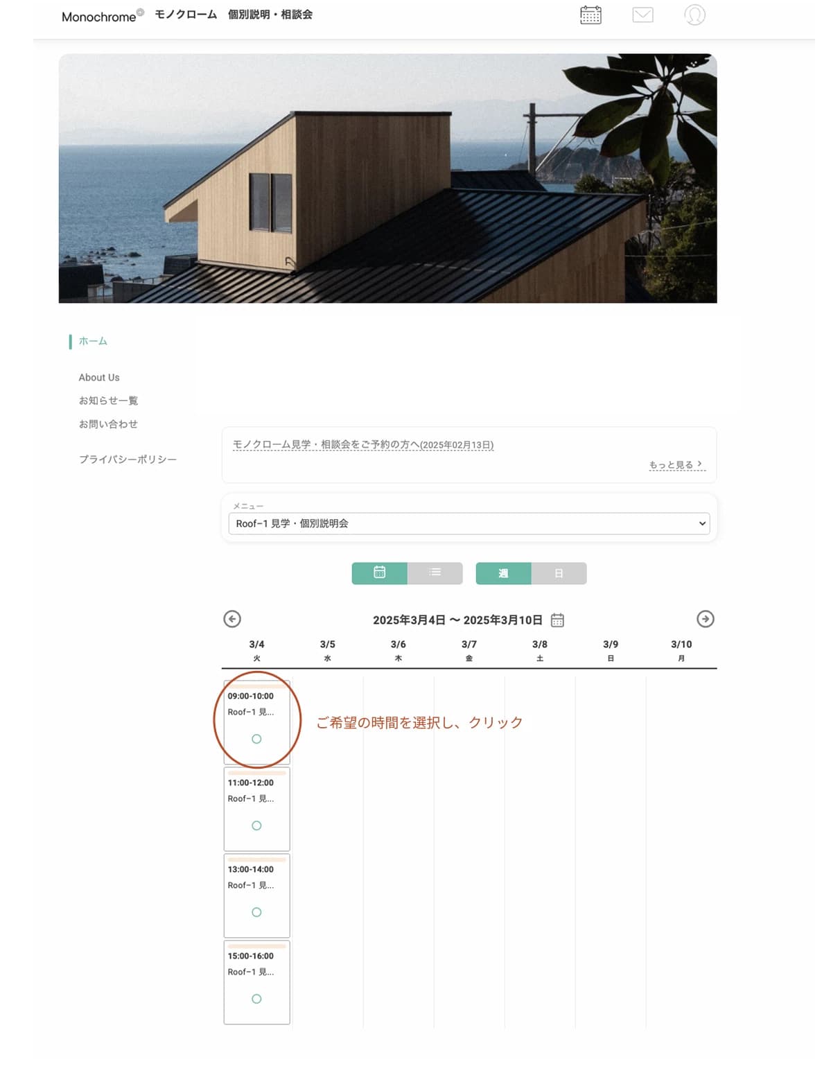 1、https://reserva.be/monochromesoにアクセスします。 ホーム画面をスクロールし、メニューで[Roof–1見学・個別説明会]を選択すると、予約時間の時間割が出てきます。週を送ると、他の日の時間割が表示されます。ご希望の時間帯をクリックし、次へ進みます。