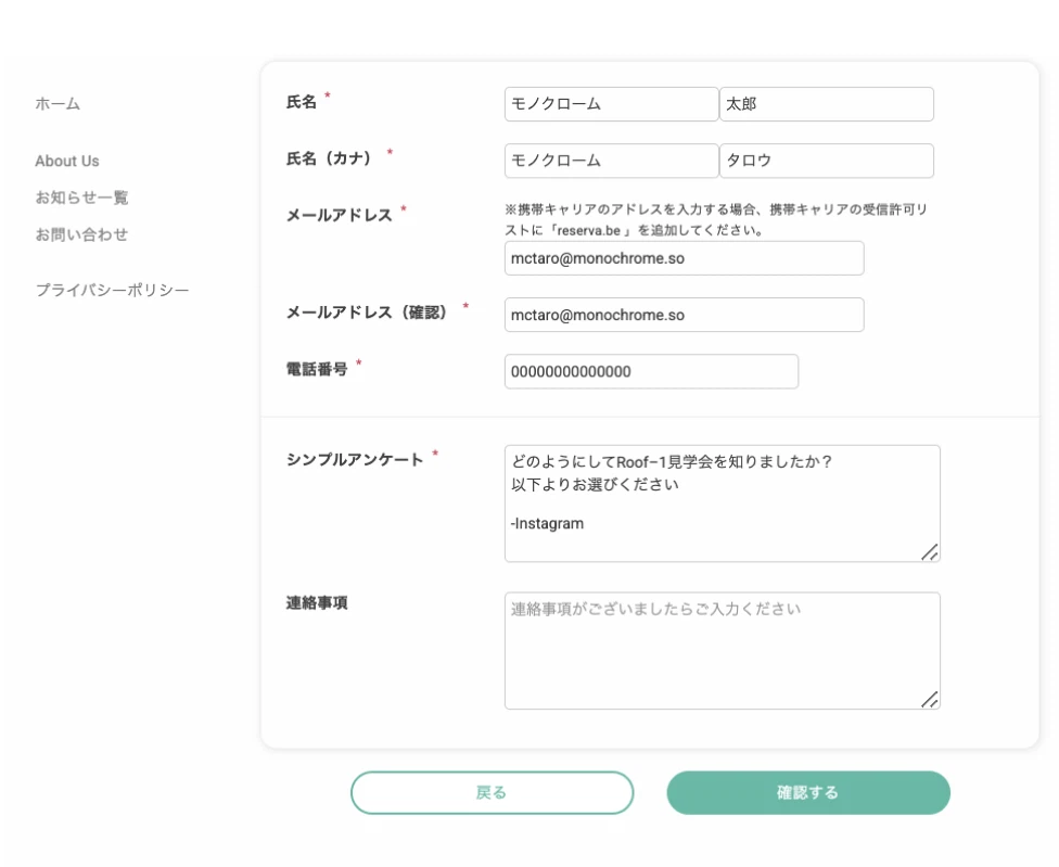 4、情報を入力、アンケートにお答えいただき、確認するを押します。