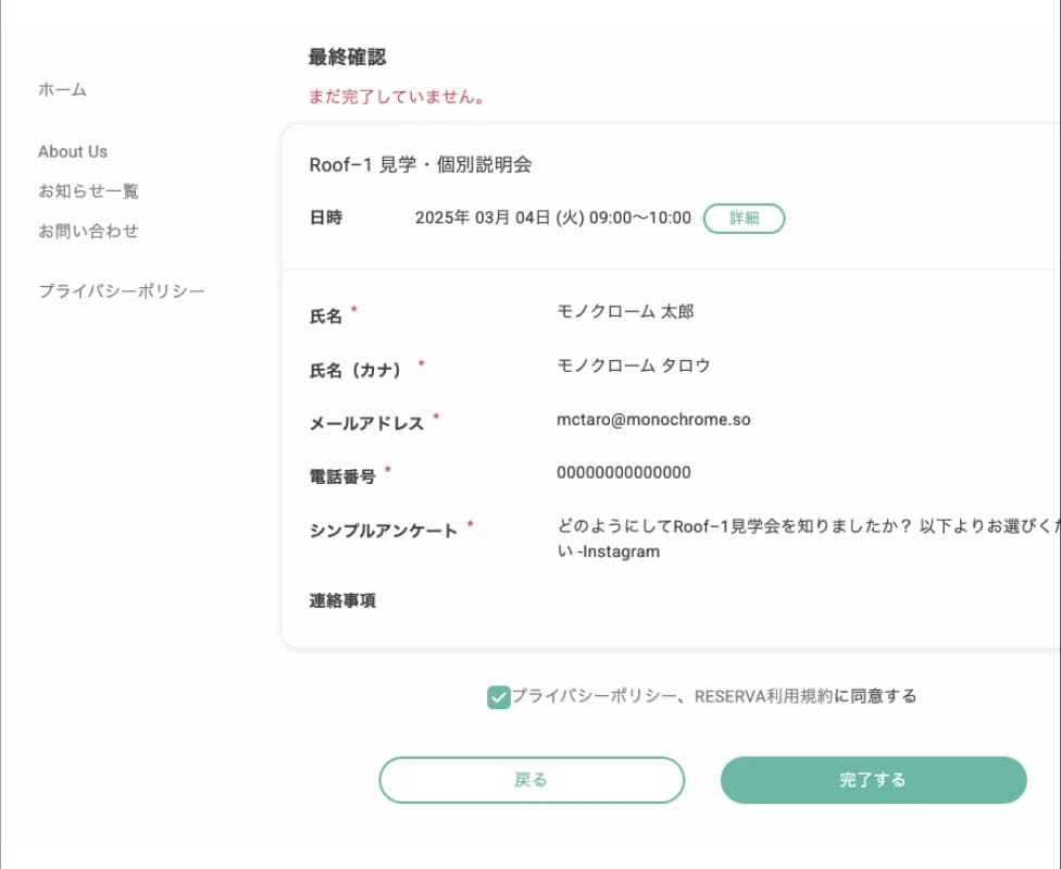 5、最終確認画面をご確認いただき、プライバシーポリシーに同意の上完了するボタンを押してください。