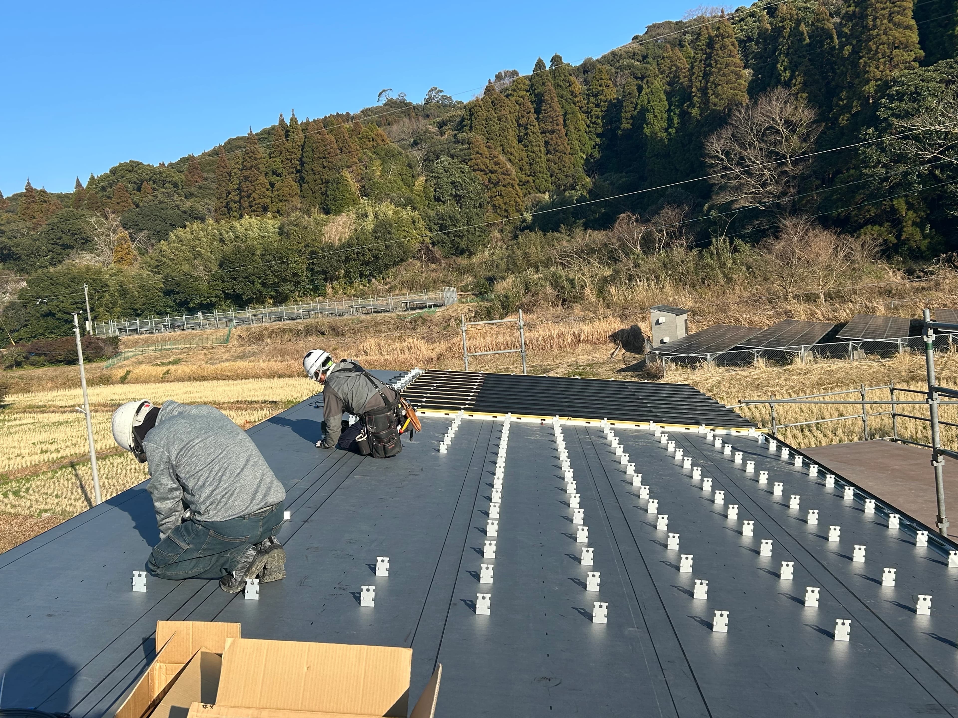 最近は、鹿児島県や山口県の現場の施工管理を担当しました。特に2月は連続で出張があり、現場管理の仕事が多かったですね。一方で、デスクワークが中心の週もあり、自分でコントロールしながら仕事を進めています。 Roof-1の施工自体は、モノクロームのトレーニングを受けた認定施工パートナーの職人さんにお願いしていますが、現場に行くことでマニュアルでは伝えきれていない点にも気づくことができました。やはり、現場と企画の両方の仕事をバランスよく行うことが大切だと改めて感じました。
