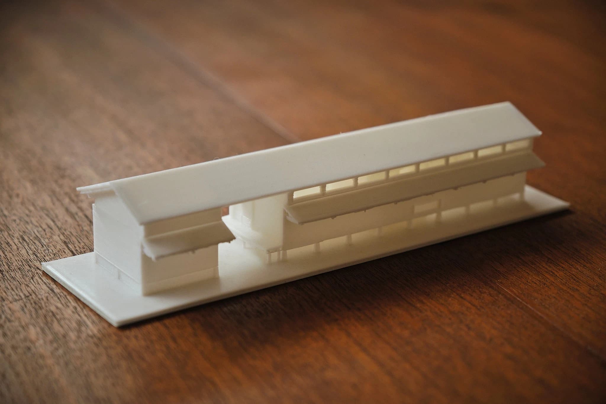 玄関を開けて最初に目に入ったのは、天井の高いLDKの空間だった。東側にずらりと並んだ高窓から朝の光が斜めに差し込み、白木のような柔らかい色合いの空間を照らしていた。その光景に見とれながら一歩家に踏み入れると同時に、ふっと身体が緩むのを感じる。外の冷たい空気から、包み込まれるようなやわらかな温度に切り替わる瞬間だった。 室内の空間は、南北に細長いワンルームのような間取りになっている。仕切りはほとんどなく、LDKから寝室までがひとつながり。けれど、すべてが見通せてしまうわけではない。空間の中央には水回りと小さな作業スペースがコンパクトに集約されており、プライベートな空間としての寝室を緩やかに分けている。