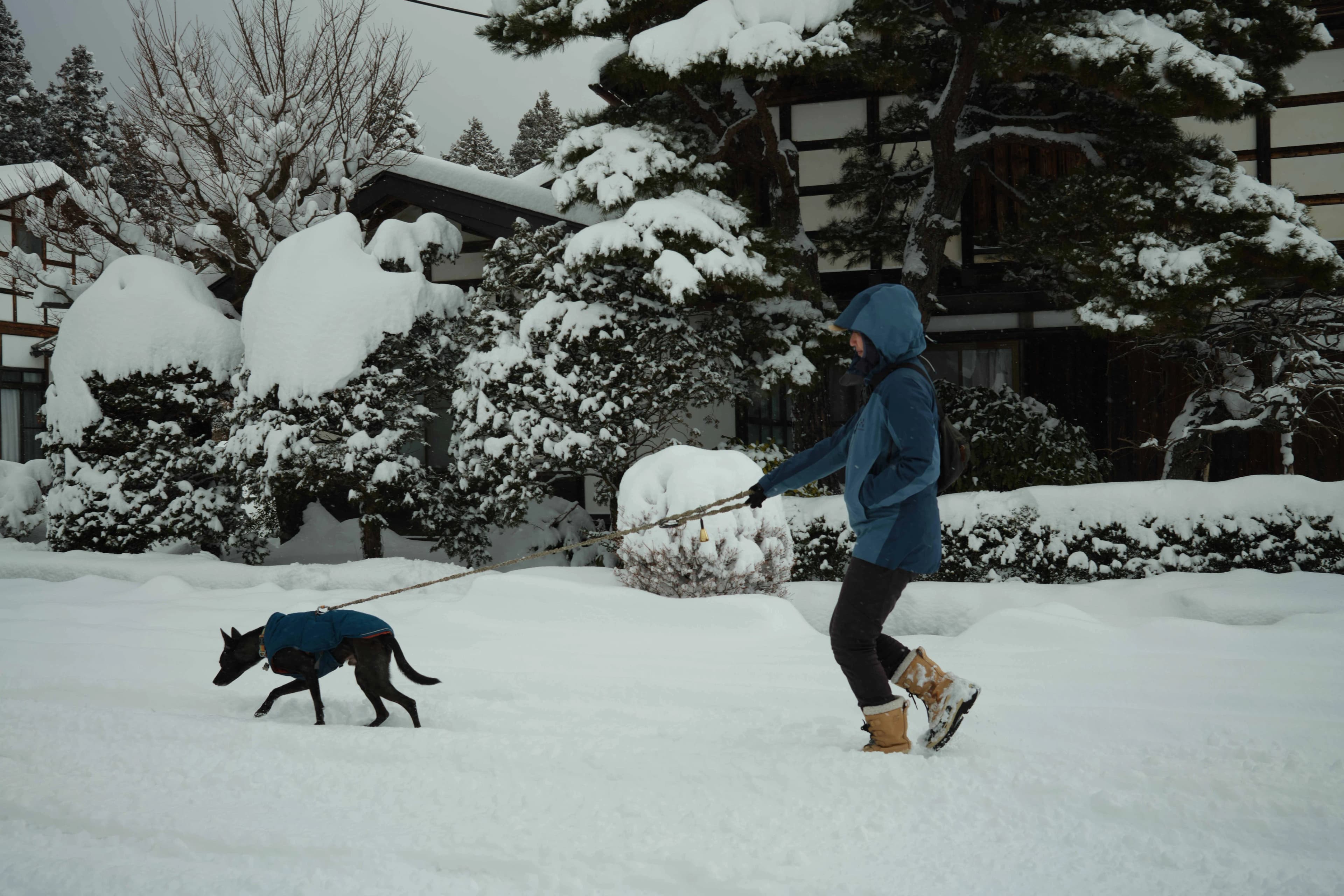 徒歩圏内にある温泉街、側溝には天然の温泉が流れ、湯気を上げている。近くには、古い街並みが残るエリアがあり、そこが彼女と愛犬クルチーちゃんのお散歩コースだ。雪かきをしながら、地元の方々が久喜さんに話しかける。犬好きの方とはすぐにお友達になったそうだ。