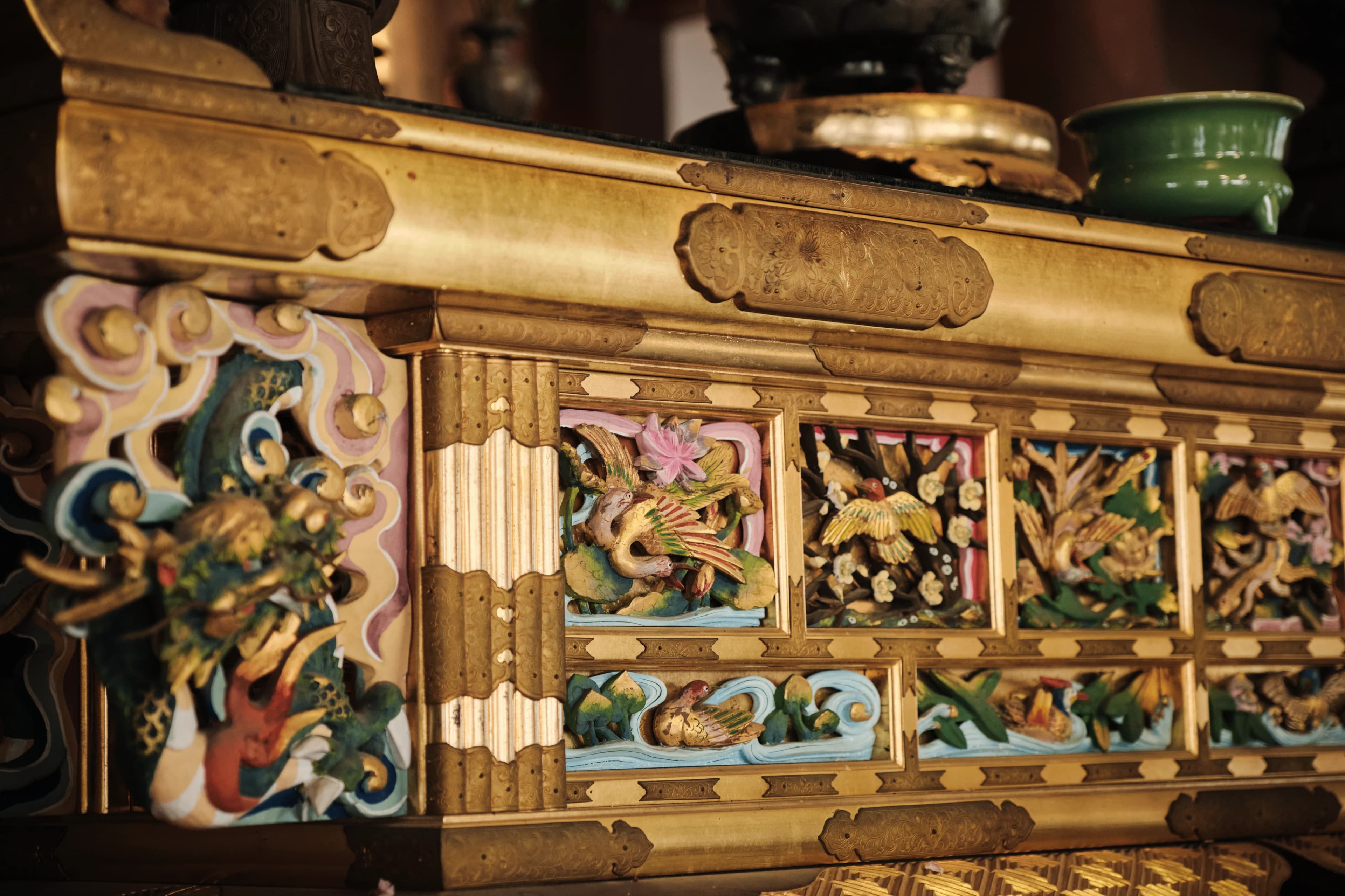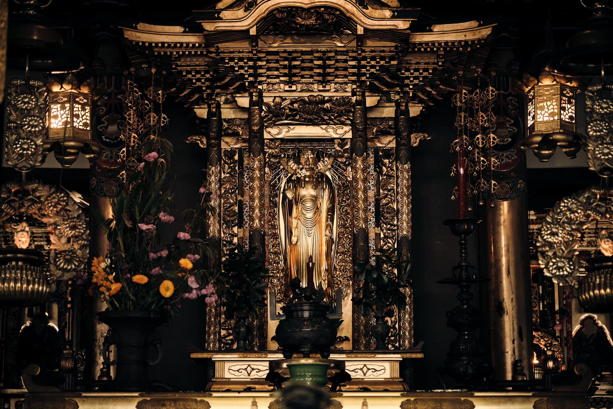 大師堂でコーヒーをもてなしてくれた後、大海さんは私たちを本堂へと案内した。建て替えられてから150年ほど経つ木造の寺の中には、浄土真宗本願寺派で極楽を象徴するという金色の美しい装飾が施されている。内陣の中央には、木造阿弥陀如来立像が厳かに坐し、堂内を見守っていた。