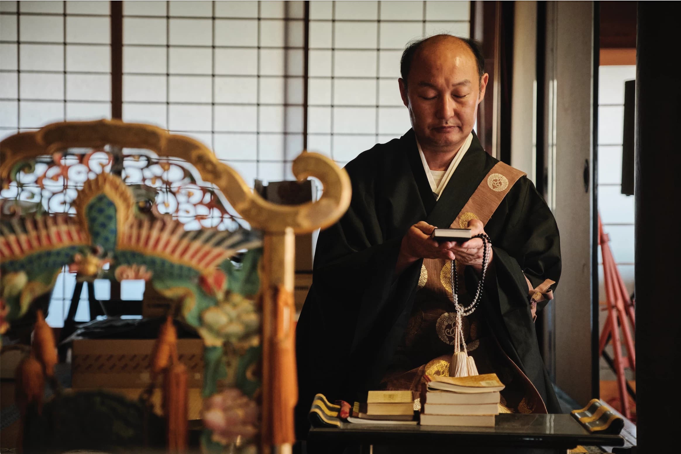 寺のすぐ隣にある庫裡から現れたのは、妙善寺の15代目住職・大海裕孝さん。彼は、到着したばかりの私たちを、今年完成した大師堂へと案内してくれた。2024年に本堂で発見された親鸞聖人の木像を安置するために建てられたのが、この大師堂だ。喫茶室も併設され、ゴールデンウィーク明けから一般の人に向けてオープンされた。